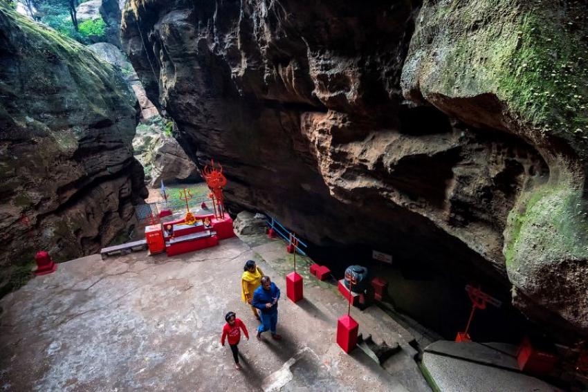 Situated 2 km deep within a narrow valley in the Mahadeo Hills, the temple lies inside a natural limestone cave, surrounded by massive boulders and steep cliffs. The entrance itself is tucked between two huge rocks, giving visitors the sense of stepping into a secret, sacred world.