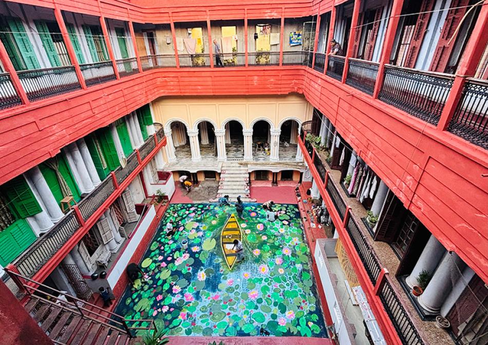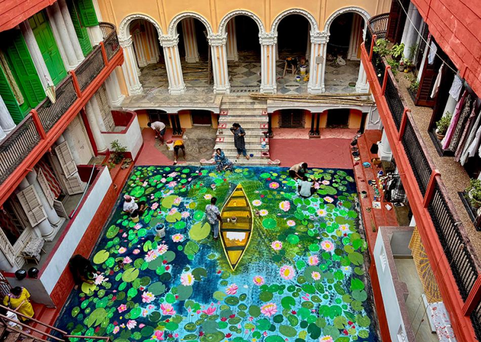 A vibrant 3D Alpana painted at the residence of Raj Krishna Mitra in Dorjipara, North Kolkata, adds a festive charm ahead of Durga Puja. Photos: Avishek Mitra/IBNS