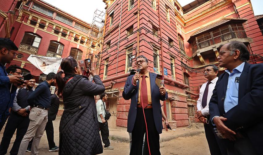 The curated route led participants through some of the campus’s most significant heritage structures. These included the main Medical College Hospital building, inaugurated in 1852 and central to the evolution of bedside learning in India; Eden Hospital, a pioneering centre for women’s and maternity care; and the Carmichael Hospital for Tropical Diseases, closely associated with early research on cholera and tropical medicine under Sir Leonard Rogers.